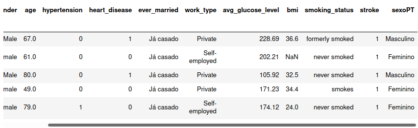 Vou utilizar como referência uma base de dados pública do Kaggle, que contém informações sobre pacientes que sofreram ou não um AVC (Acidente Vascular Cerebral). Ao passar uma lupa sobre as primeiras linhas do arquivo veremos: